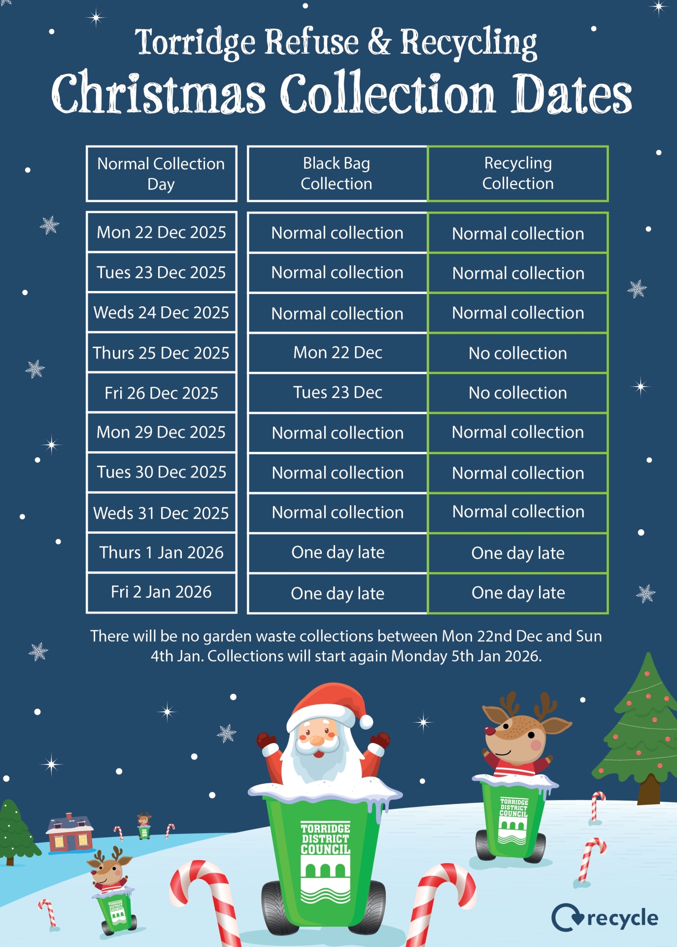 Torridge District Council is reminding residents there will be some changes to its waste and recycling collections over the Christmas period, with some typically a day later.