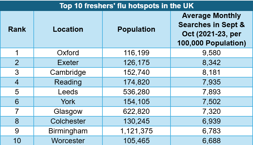Exeter ranked second, with 8,342 average monthly searches for cold and flu-related terms per 100,000 population in the two months following Freshers’ Week.