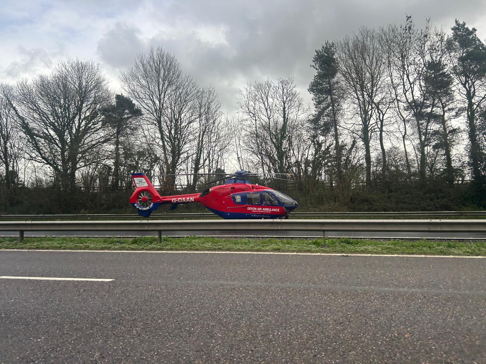 Photographs sent to Exeter Today confirm that the air ambulance has now landed on the M5 motorway between Junction 28 and Junction 29.